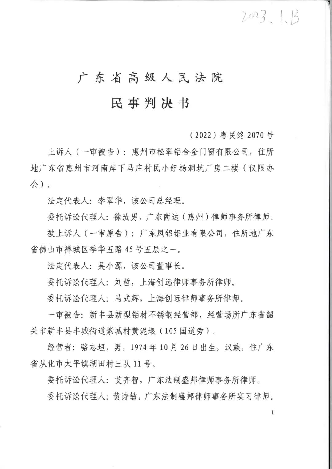 金昌辉知胜诉佳讯 | 侵害“凤铝”商标案广东高院二审维持原判,判决赔偿255万元